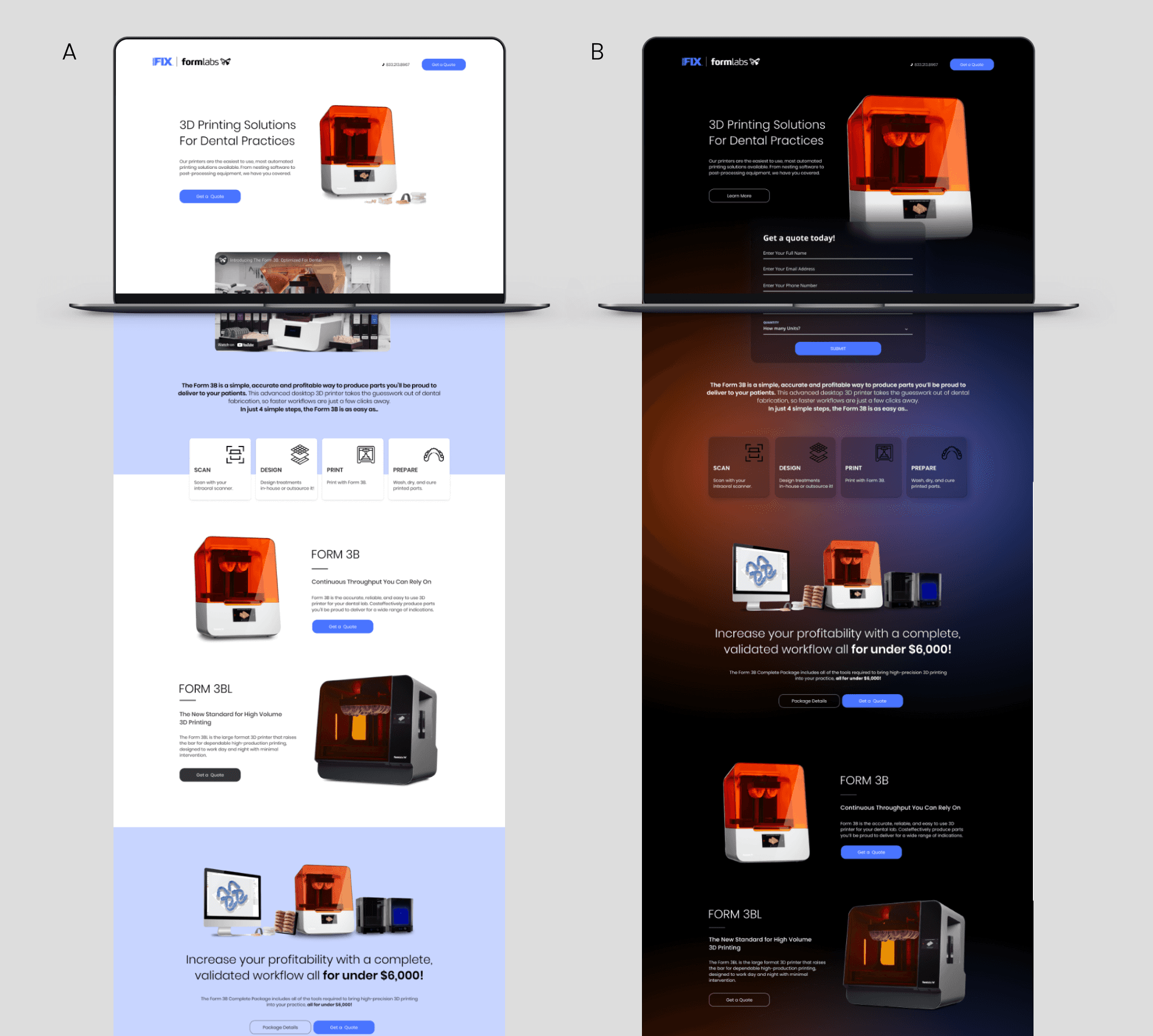 Design a flexible campaign framework enabling A/B testing, rapid iteration, and multi-product scalability. The solution needed to balance two brand identities (Dental Fix and partner brands) while supporting performance optimization through testing. Initial launch focused on Formlabs 3D printers with the expectation of expanding to additional equipment categories and brands.