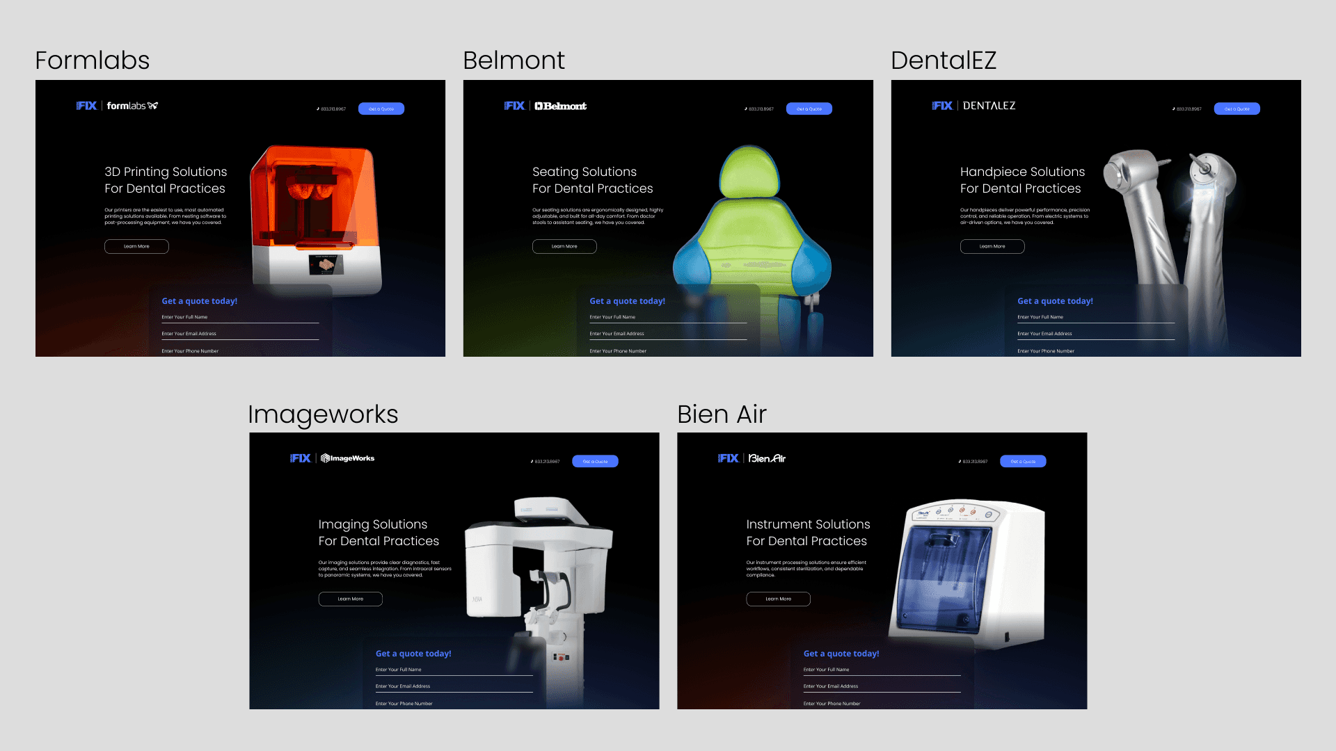Modular Component System: Reusable hero sections, benefit blocks, product showcases, forms. Extended beyond Formlabs to 6+ equipment brands (Belmont, DentalEZ, ImageWorks, Bien-Air) using same framework.