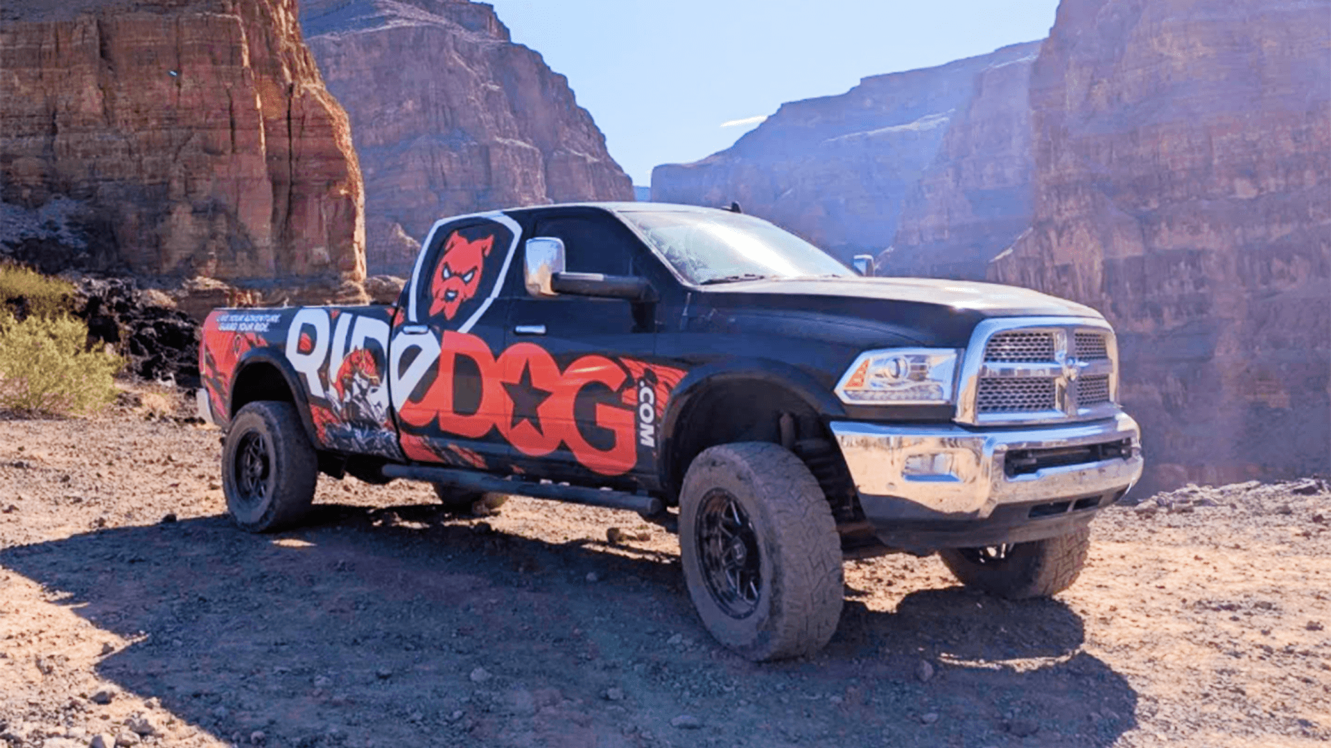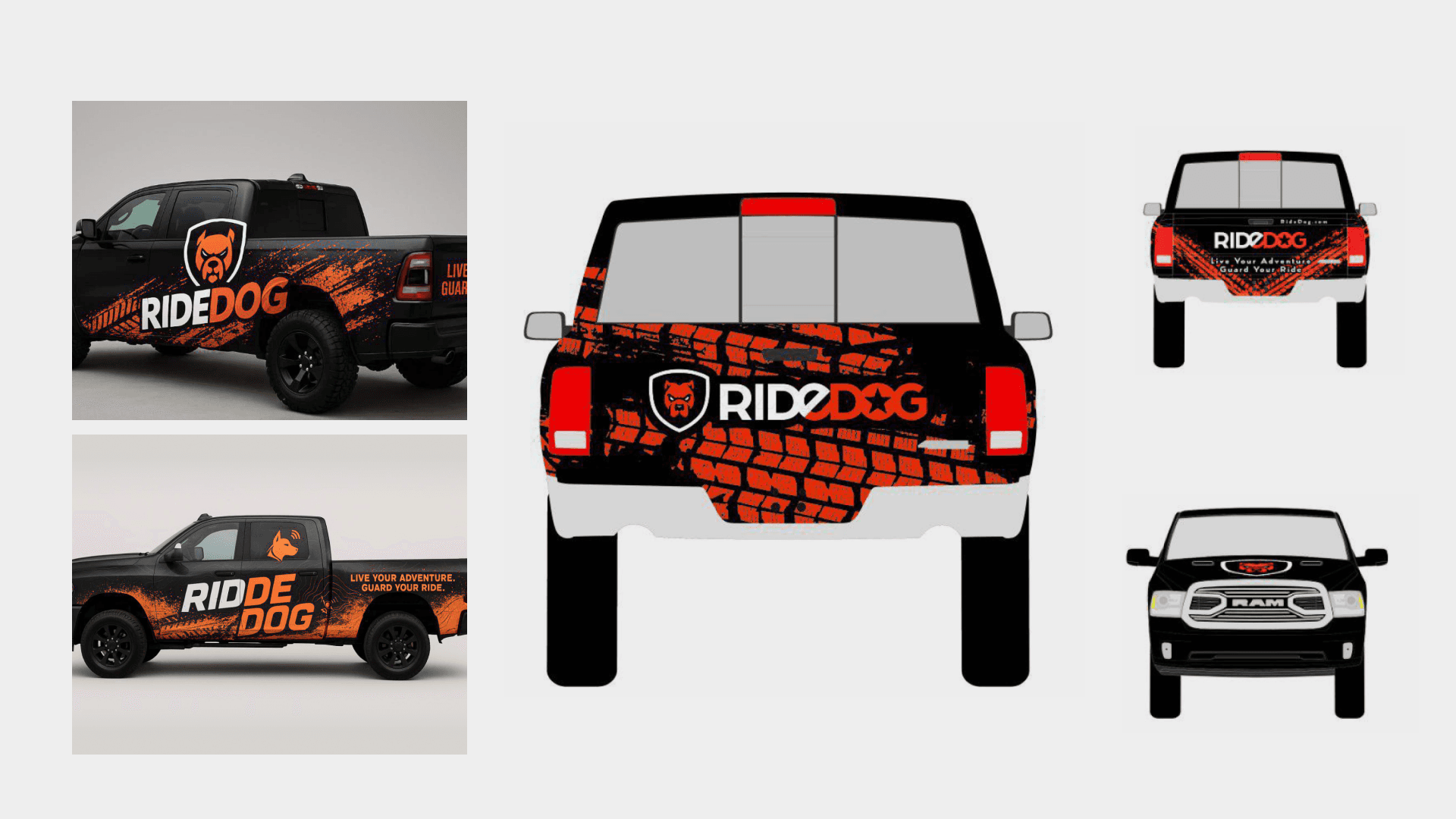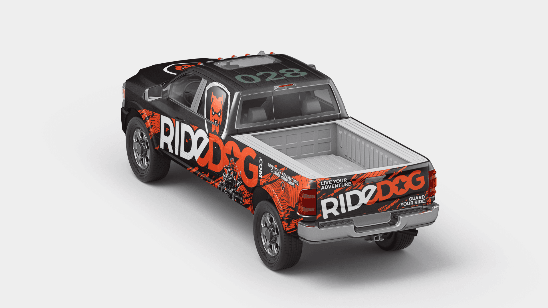 Ridedog needed to refresh its fleet graphics to align with a new company motto: "Live your adventure. Guard your ride." The fleet vehicles were planned as the visual centerpiece of an upcoming social media campaign, requiring graphics that could carry the brand story both on camera and in motion while differentiating in the crowded off-road GPS tracking market.